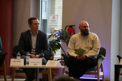 Foto: David Rauber (SPD) und Sebastian Brockhoff (Bündnis 90/Die Grünen) sitzen neben einander auf dem Podium (© Wilhelm-von-Oranien-Schule).